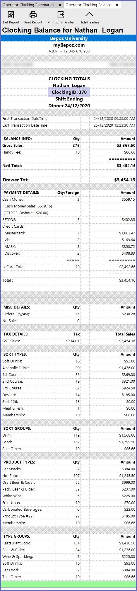 - If an Operator has multiple Clock In/Clock Out occurrences during one (1) shift, this will report their Sales Summary Data separately - per Clock In ID