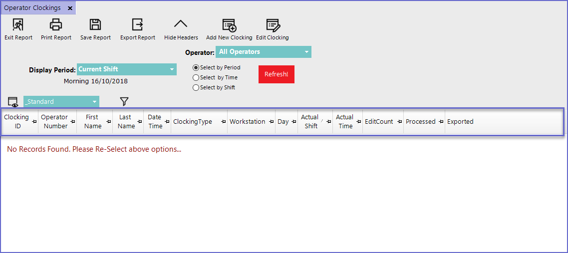 - The Operator Clocking Report Standard View contains the following data columns by default: