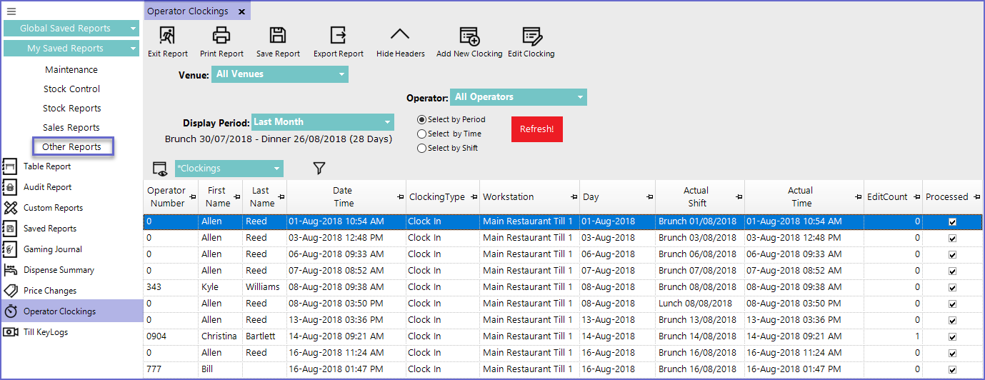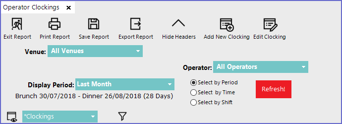 - Select Operator Clockings which will open a new Operator Clocking Window