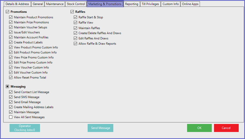 The tab contains a number of privilege flags relating to Marketing & Promotions and is broken down into the following sections: Promotions, Messaging, Raffles & Draws.