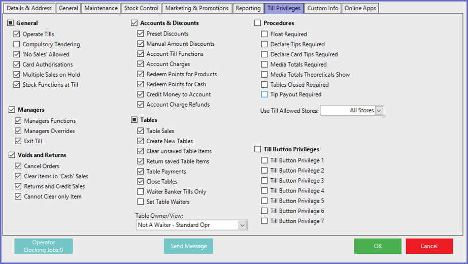 This tab contains a number of privilege flags relating to specific Till operations and processes.
