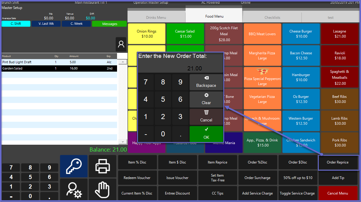 The 'Order Reprice' discount allows Operators to manually enter the discount amount on the Total Order amount.