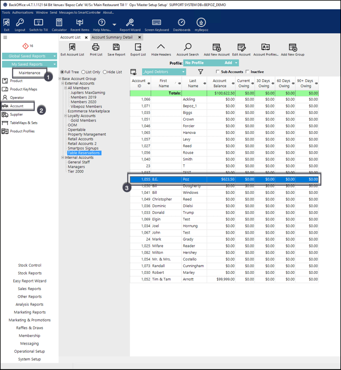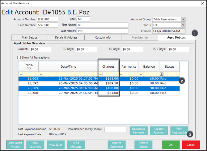Due to the nature of the Aged Debtor tab, only account payments and account charges are listed here. Meaning any transaction that is finalised through cash or EFTPOS will not be available through this workflow.