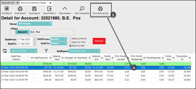 Users can access the option to print packing slips via the Aged Debtors tab in the account maintenance form or through the Account Summary Detail screen. A PDF slip will be generated containing the accountholder information, transaction date and ID along with the relevant product information.