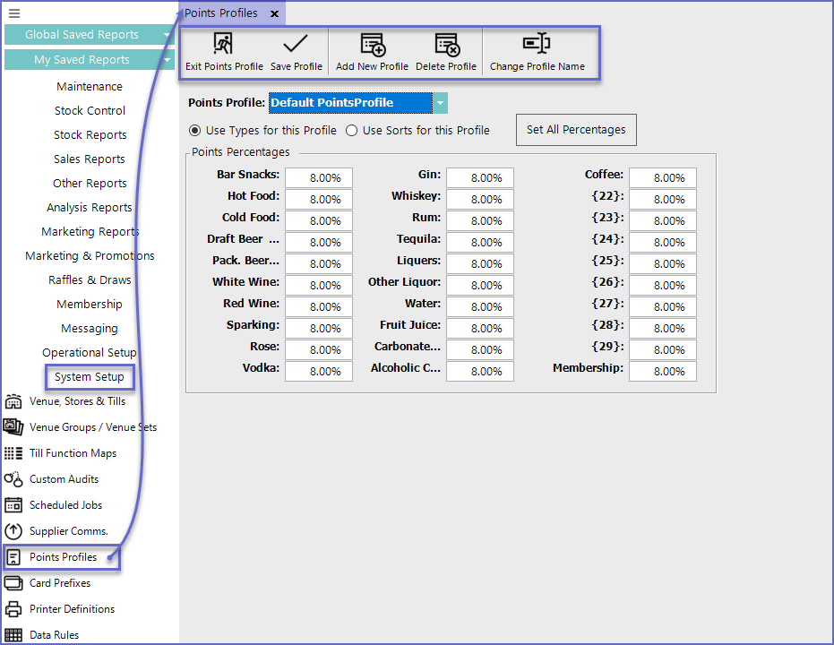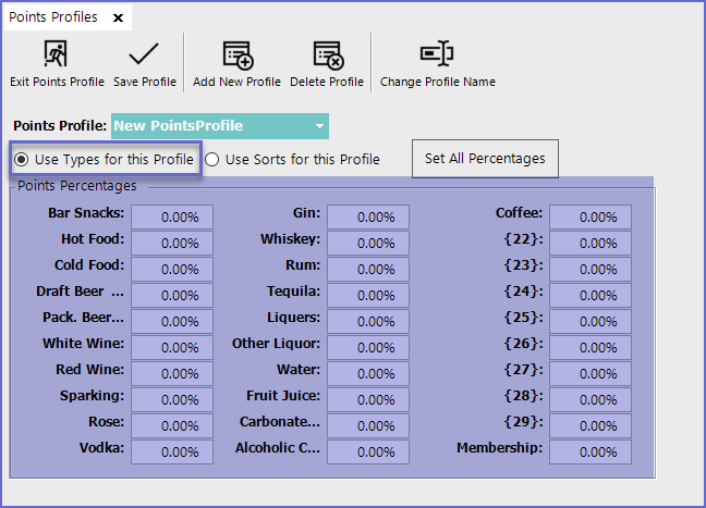 - This option will select the System's Product Types to set the Points percentage for the Profile