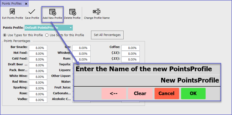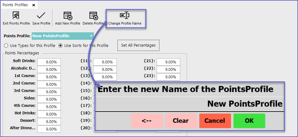 - This window contains a number of buttons which can be used for Adding a New Points Profile, Changing Points Profile Name and Saving a Points Profile