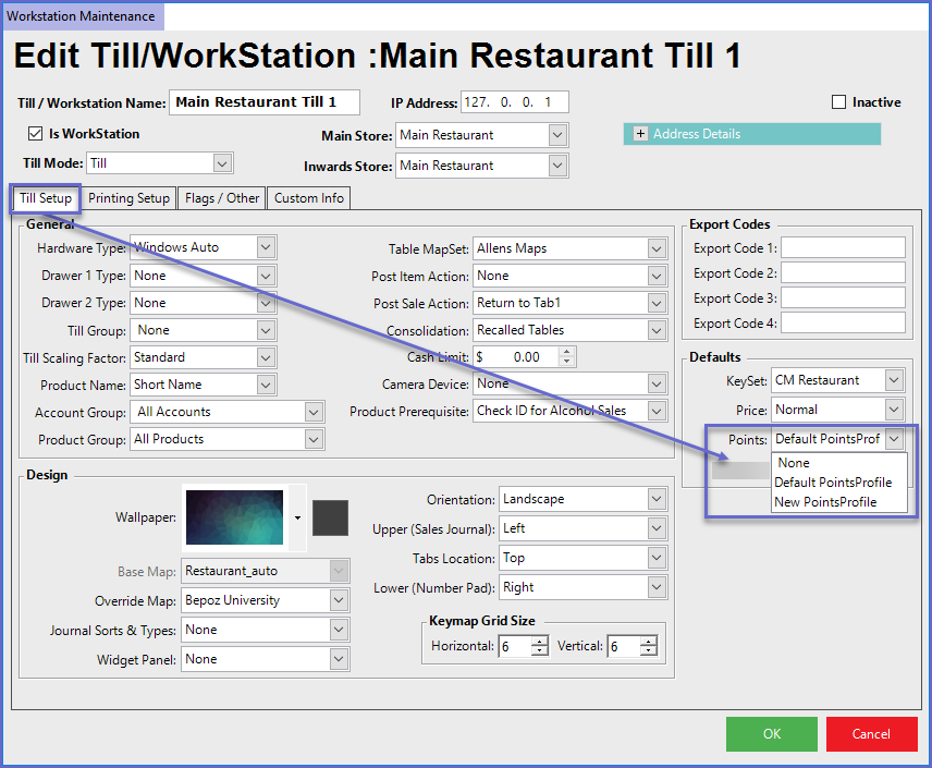 - For the Points Profile to function, the desired Points Profile must be Selected in the Defaults Section of Workstation Maintenance > Till Setup