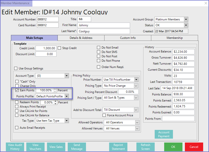 - Here, the Point for each Product Type/Sort is set to 10% in the Points Profile and Earn Points in Member Maintenance is set to 100%