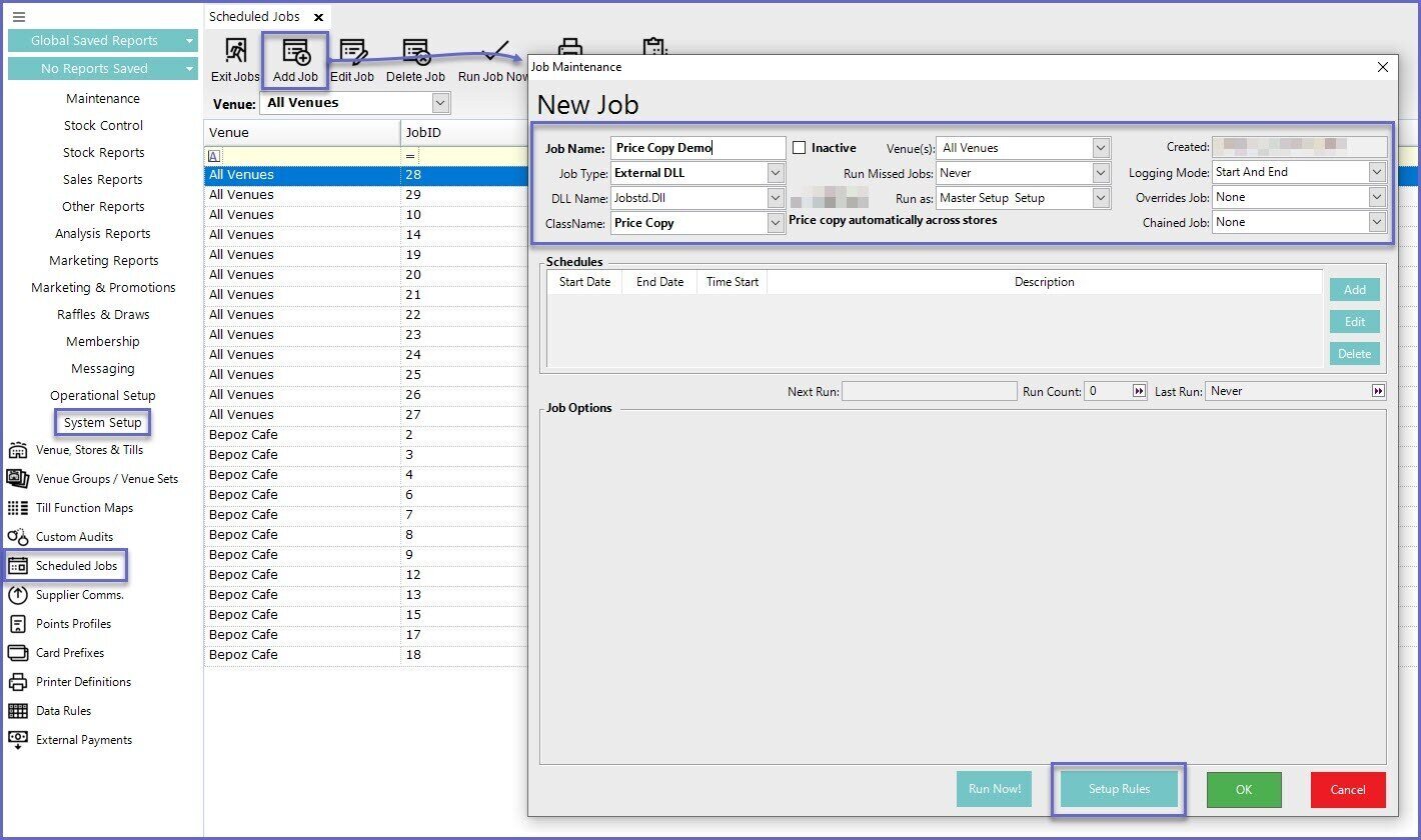 Getting Started- To get started, navigate in BackOffice to System Setup > Scheduled Jobs