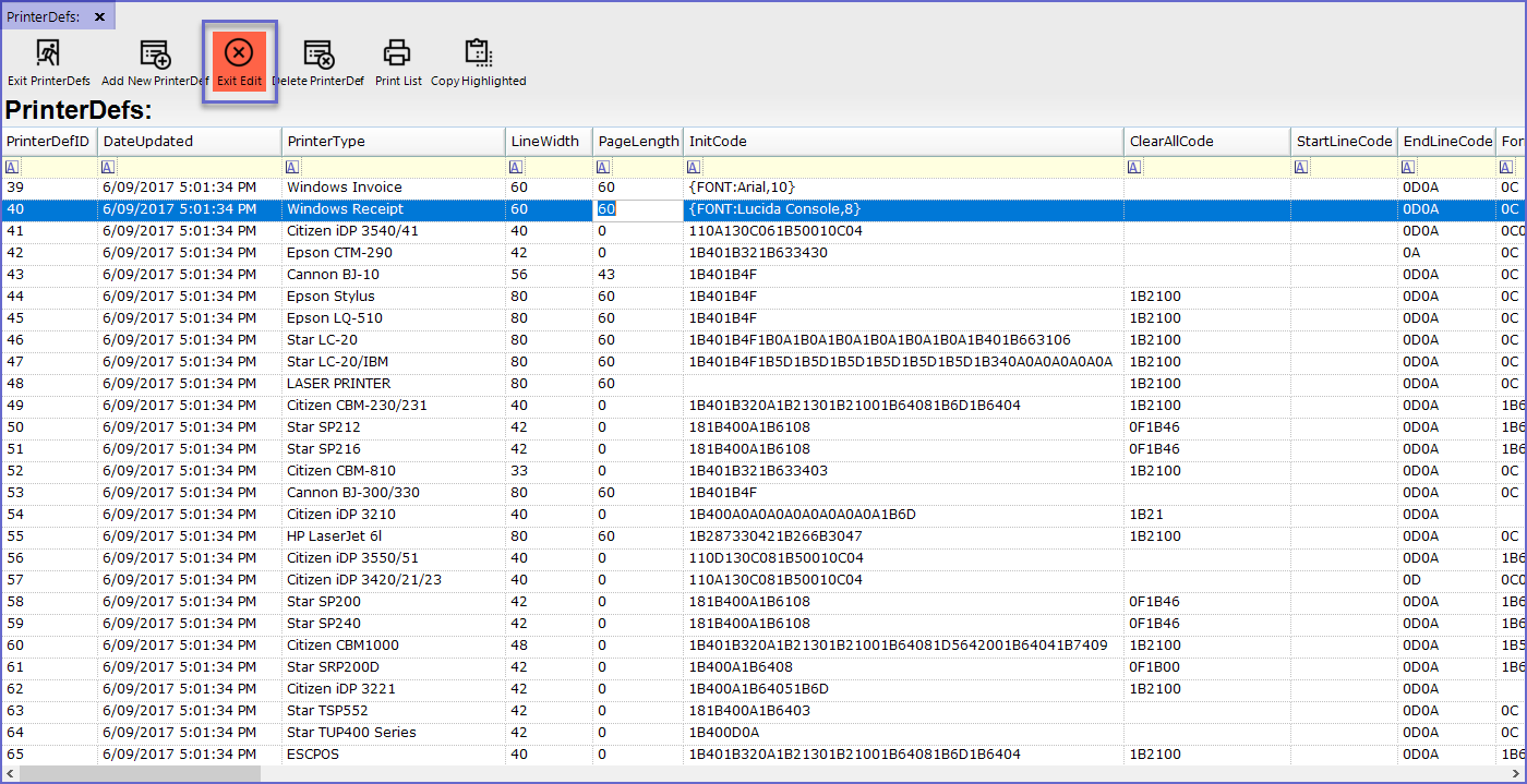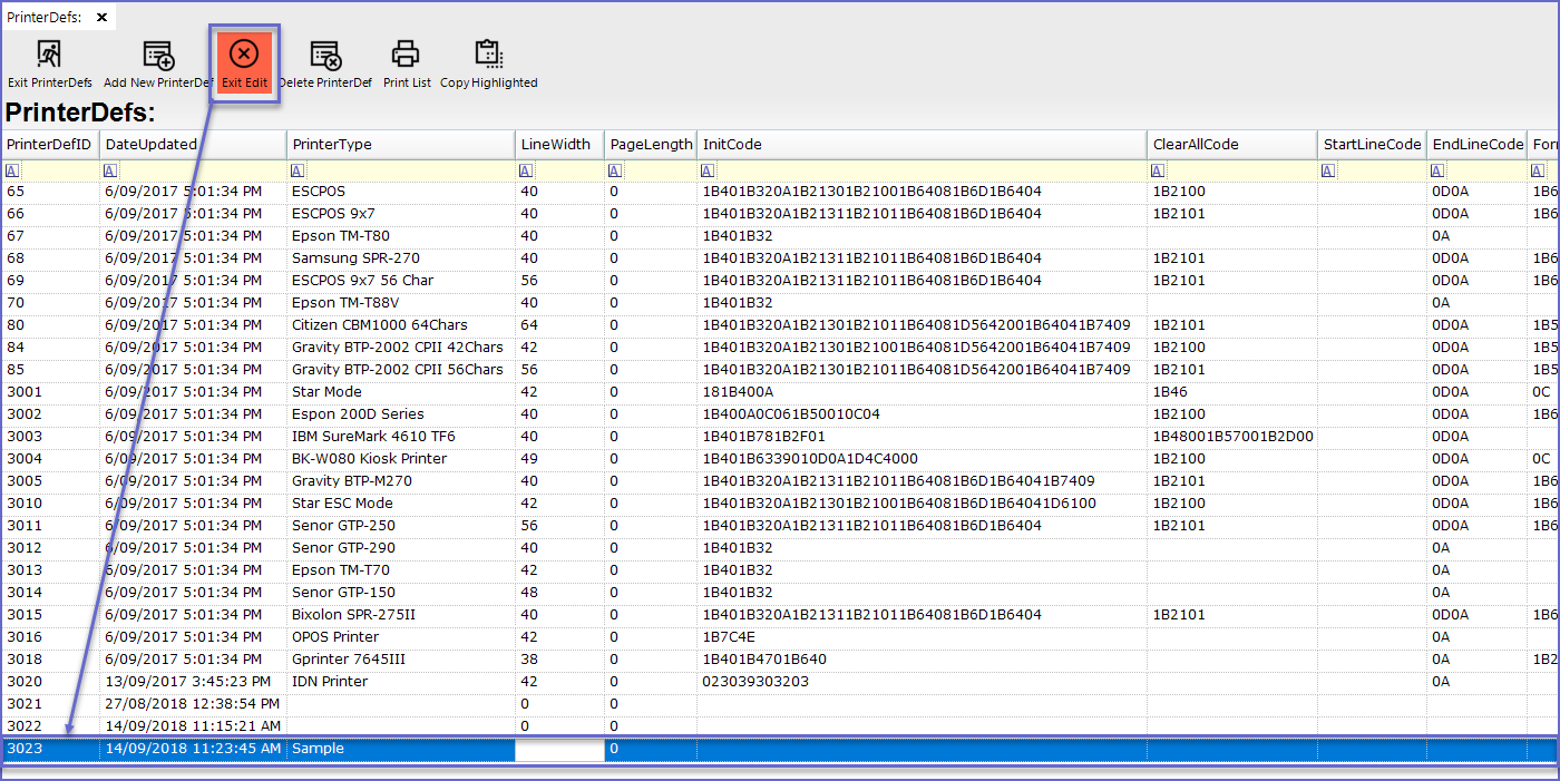 - To edit the PrinterDef, Click on the 'Edit Mode' button at the header or Double-click on any line to be edited