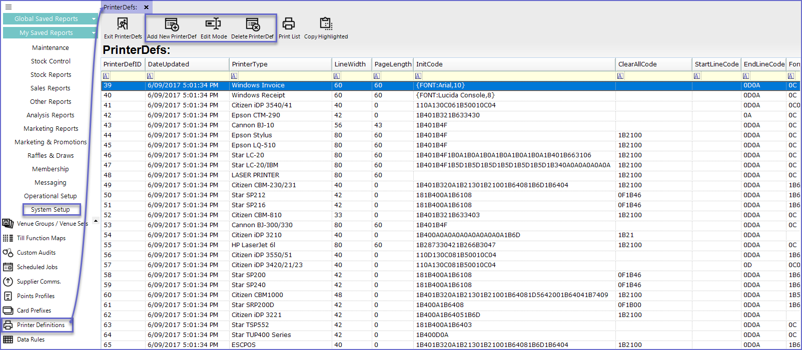 This article covers access to Printer Definitions, Adding a new Printer Setup and Deleting Setups.