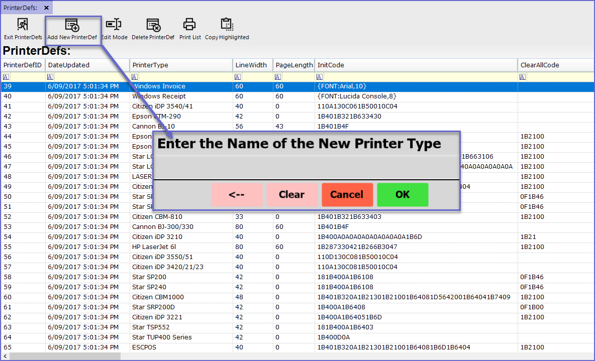 - To add a new Printer Definition, Click on the 'Add New PrinterDef' button at the MenuBar which will prompt operators to Enter the Name of New Printer Type