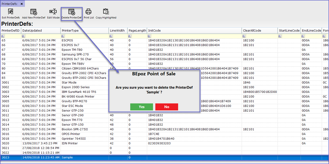 - To Delete the Printer Definition, highlight the printer name and Press 'Delete PrintDef' button at the header