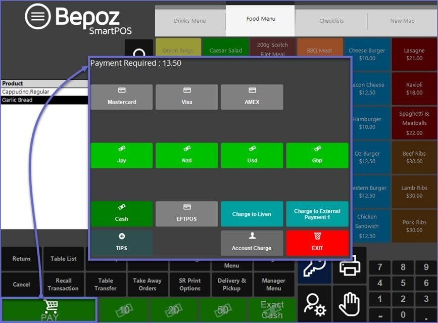 - Tapping the Pay button will open a Payment Window allowing for various additional Payment Methods