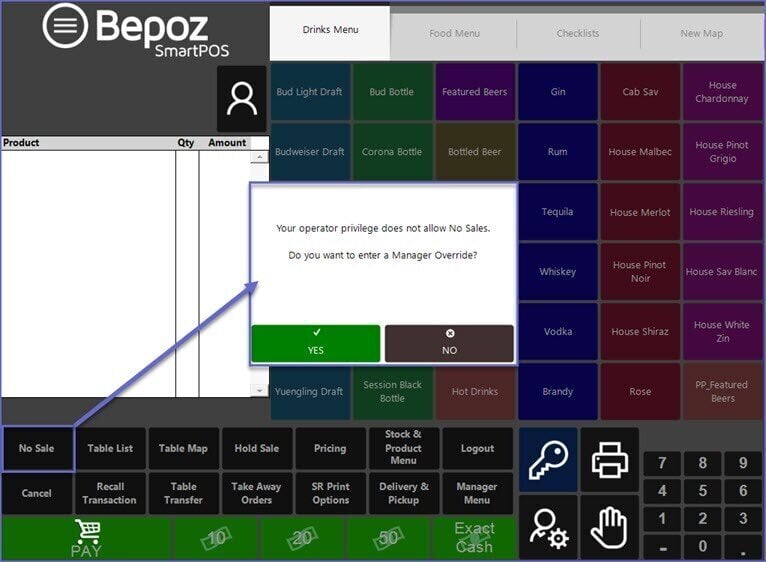 - An Operator with the No Sale Function privilege enabled who is also authorized to conduct a Manager Override can then override the message and a No Sale can be completed