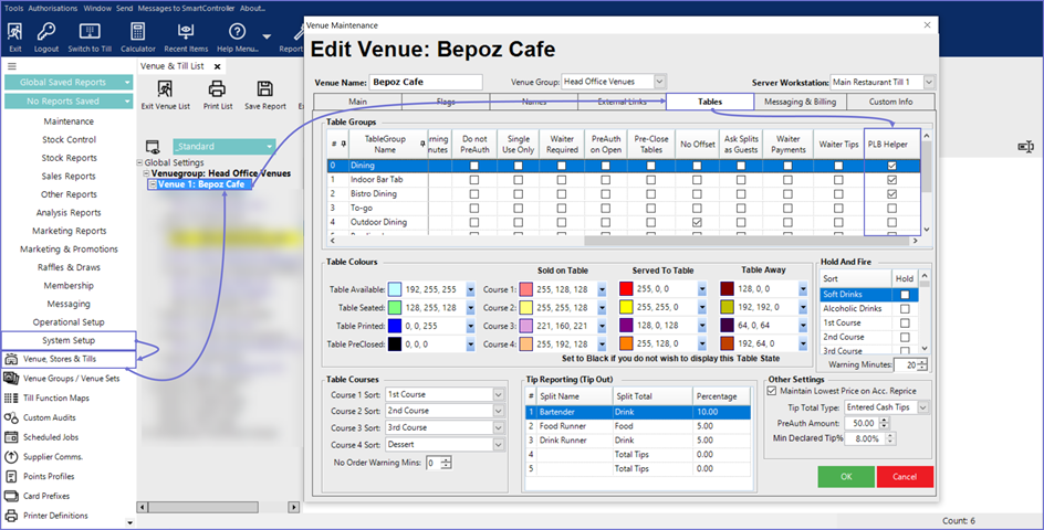 - Within the Venue Maintenance window, go to the Tables tab and within the Table Groups, scroll all the way to the right to view the 'PLB Helper' column