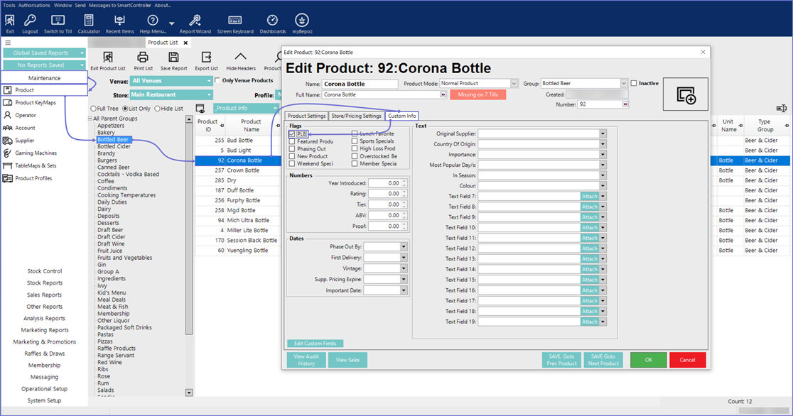 - Once the Product Maintenance window is opened, head to the Custom Info tab, within the Custom Flags field, set one flag as 'PLB' as an identifier for using the Product Level Blocking feature