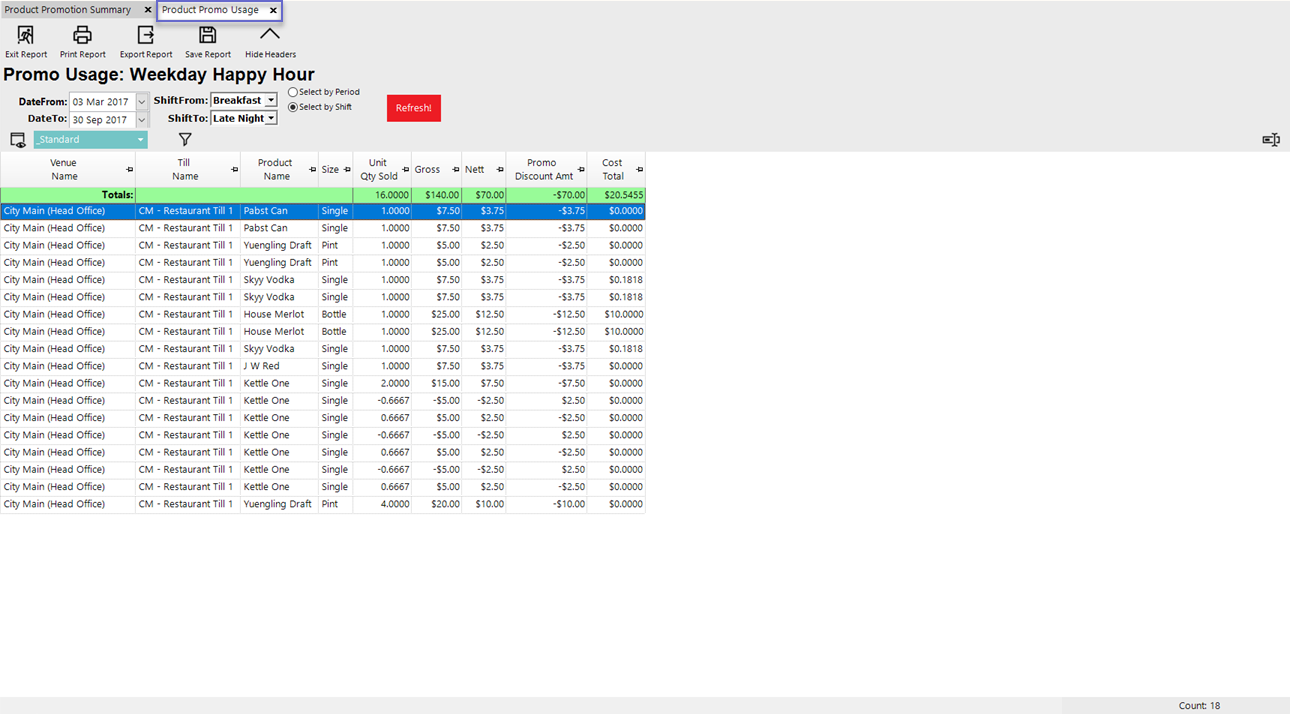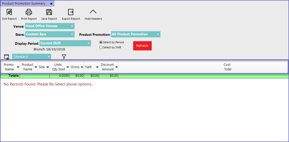 This can provide a snapshot insight of how a Promotion/s is performing - which Products and/or Sizes are popular or unpopular, how the Promotion is affecting the Nett, and the ability to quickly compare to Cost Total.