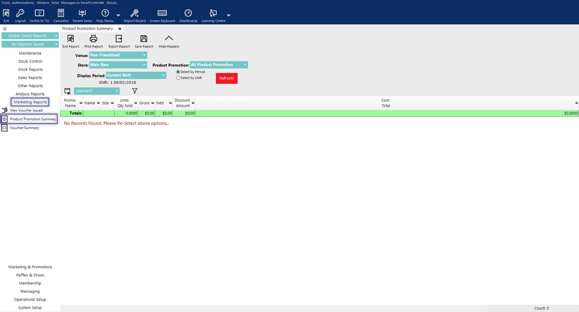 - After expanding the Marketing Reports menu, the Product Promotion Summary will be available for selection