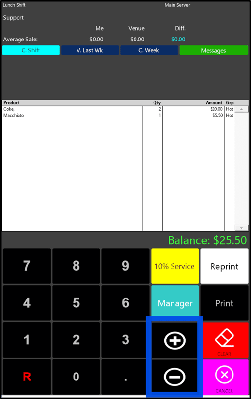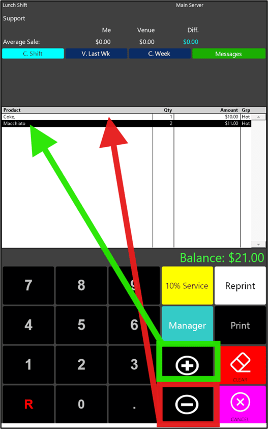 - The Coke has had its Quantity decreased by 1 using the - Quantity Button (Red highlight)