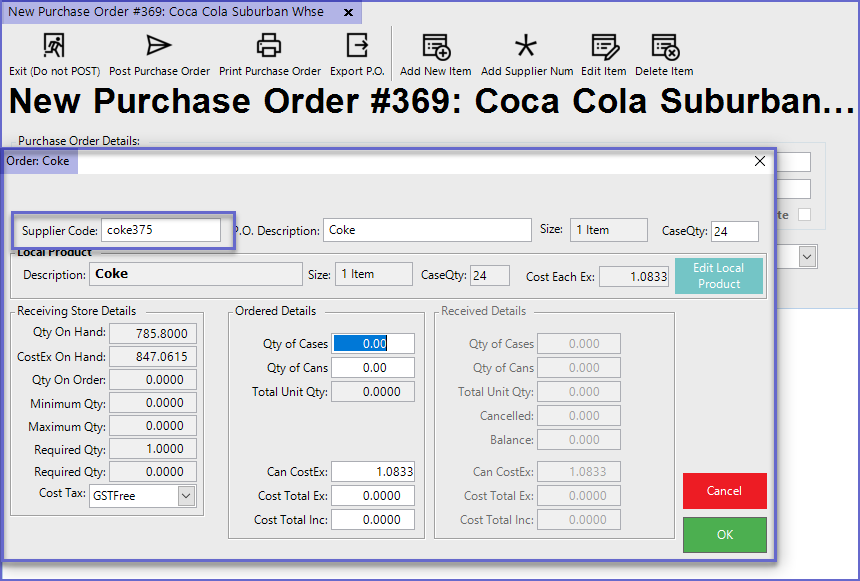 - When creating a PO and adding this Product, the PO Default Product Code will be entered as the Supplier Code