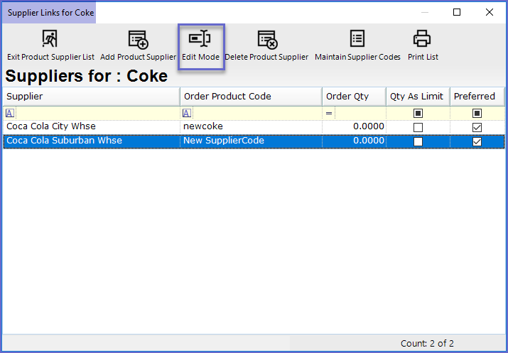 - To set a Default Supplier Code, use the Edit Mode from the Supplier Links window, then choose the desired Code from the drop-down