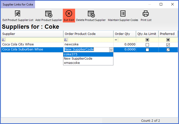 - After entering into Edit Mode, a drop-down containing the available Supplier Codes for each Product will be accessible