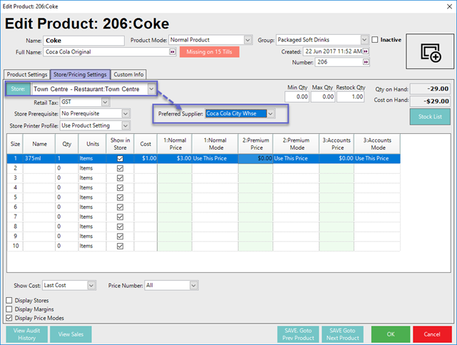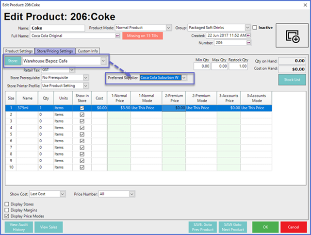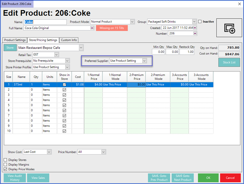 - The Preferred Supplier for a Product can be set by Store using a drop-down which is located on the Store/Pricing Settings tab of the Product Maintenance window
