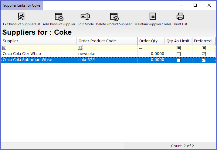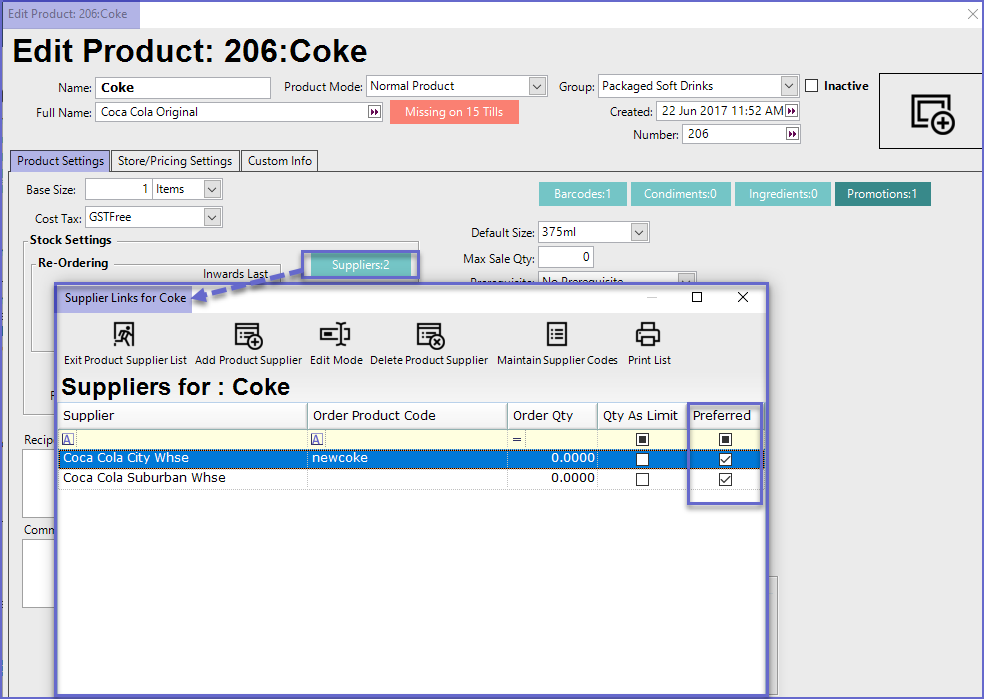 - The customer can configure the Town Centre Restaurant store to have the Preferred Supplier as the Coca-Cola City Whse for their Coca-Cola Products, while the Warehouse Cafe can configure the Coca-Cola Suburban as their Preferred Supplier