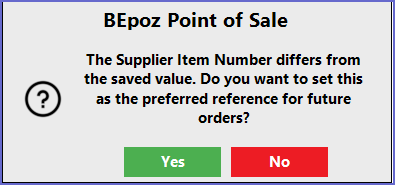 - If the Supplier Code is changed when creating a new Purchase Order, the following Warning Message will appear; select Yes to set the Supplier Code as the PO Default
