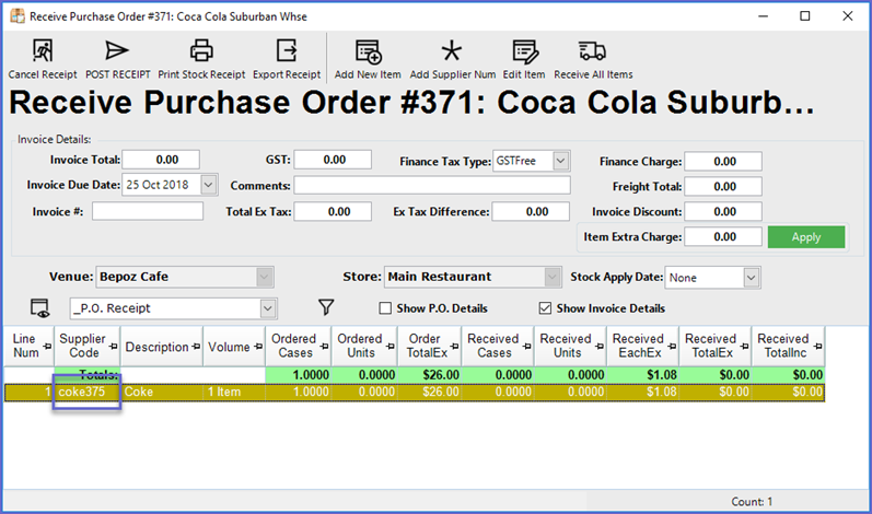 - When using Supplier Comms to receive an Invoice which is using an alternate Supplier Code than the Supplier Code marked as PO Default, the Product will be matched when being Received and the PO Default Supplier Code will appear on the Received Purchase Order