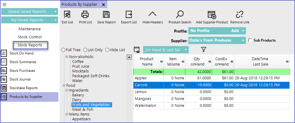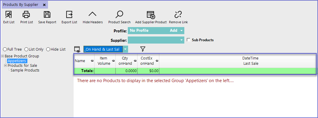 "_On Hand & Last Sale" View- The On Hand & Last Sale View is one of the default Views on the Products by Supplier Report and displays the Products on Hand & the Date/Time the Product was last Sold