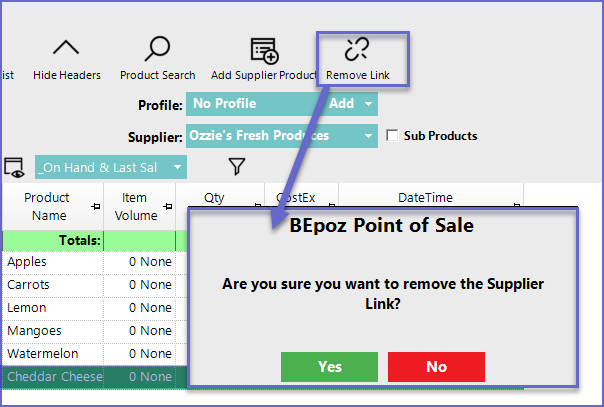 To remove Products from a Supplier, highlight the Product in the display area and click on Remove Link and click Yes