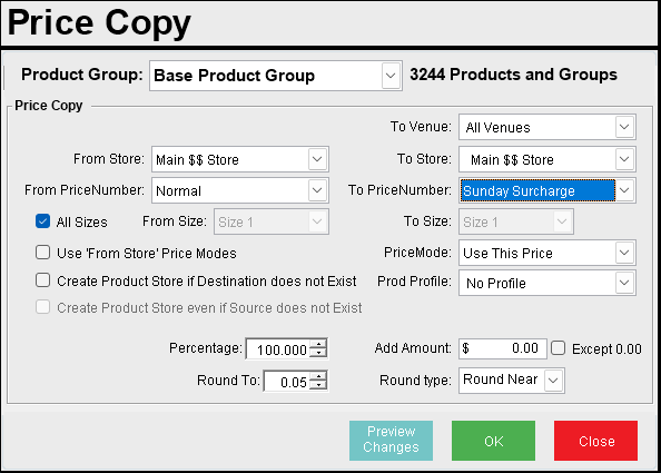 - Select the To Store and To PriceNumber as Main $$ Store and Sunday Surcharge PriceNumber