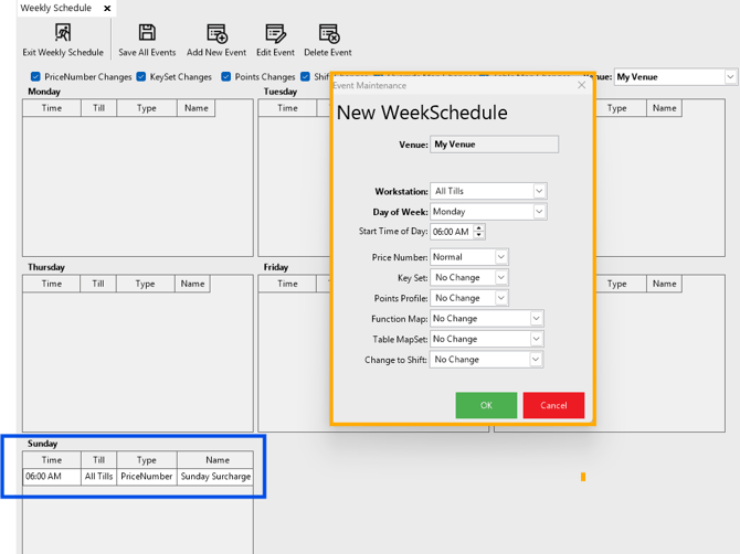 Each weekday schedule requires 2 Events– one to turn ON surcharges and another to turn them OFF again. This is useful for regular Sunday surcharges, etc