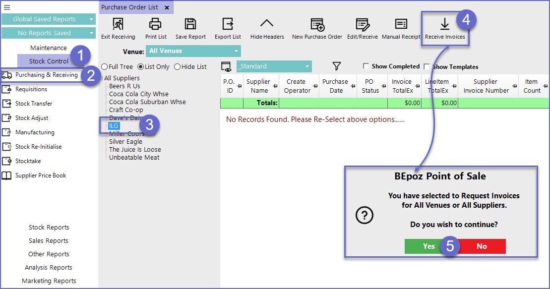 - This will open a new window named Receive Invoices where all of the available invoices from the Supplier are listed