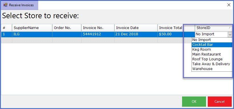 - Before pressing OK, select the StoreID from the drop-down menu to ensure that the product is received in the correct store