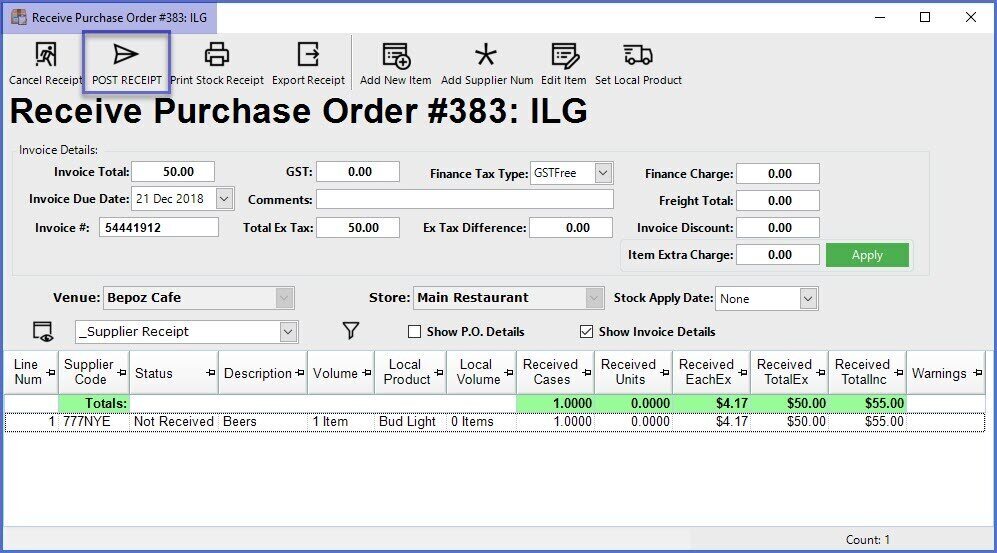 - Select the Post Receipt button from the menu bar
