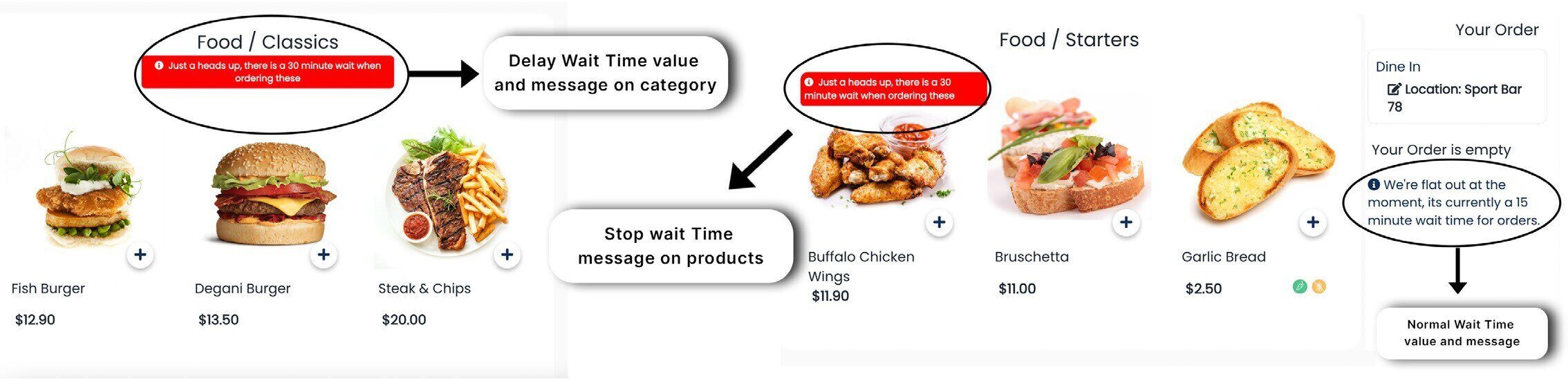 2. Wait Time for Product/Category – Makes customers aware of the current wait time before they order. Staff can add a delay wait-time function to increase the wait-time period when the venue is busy or a stop wait-time function to make a product/category temporarily unavailable. In addition, different wait time options can be applied to different ordering types. For example, You can set a wait time on whole desserts category or just the apple pie. You can also set no-wait time for dine-in customers for a specific item but for the same item, you can add a wait time for take away customers.