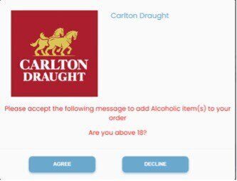 3. Age Restriction on Alcoholic Items – Asks users a YES/NO prompt to confirm their eligibility to buy alcohol when the first alcoholic item is selected on the YourOrder menu. The selected answer will be recorded on the Transaction history.