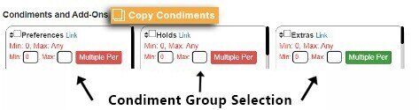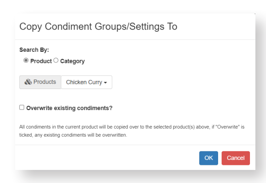 4. Copy Condiment Group – Allows users to copy condiment(s) and informative settings from one product to a selected Product(s) or category(s). It will copy the condiment group selection and settings to the other products/categories.