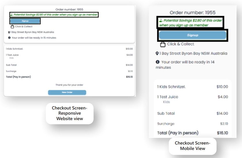 6. Potential Saving – Shows guests the potential amount that they can save as a member. It encourages end users to sign up as members to get more benefits. A sign-up button can be added to the checkout screen for easier sign-ups.