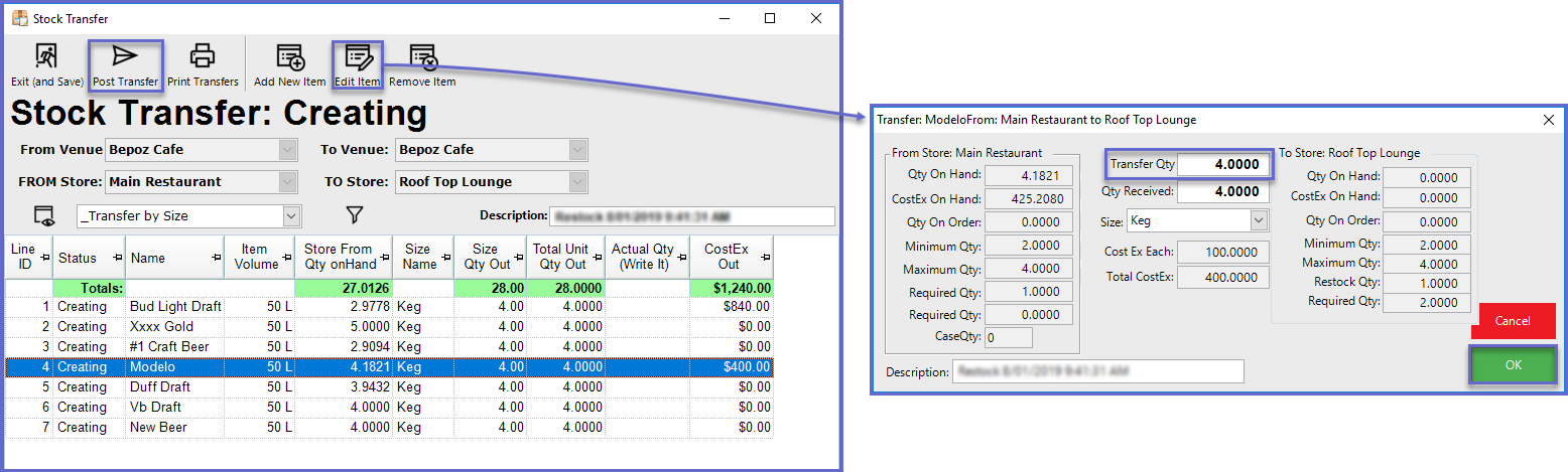 - In the Stock Transfer Window, highlight the desired product and select the Edit Item Function