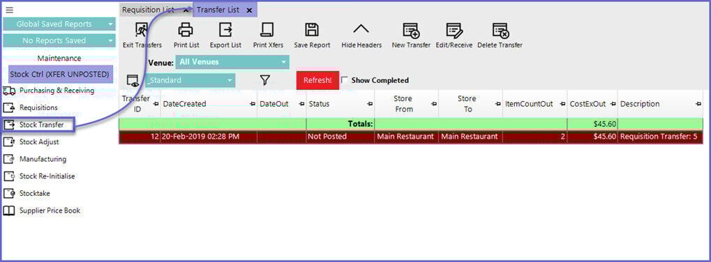 - To begin a new Requisition, first select the Stock Control menu in BackOffice and then Requisitions which will open a new window