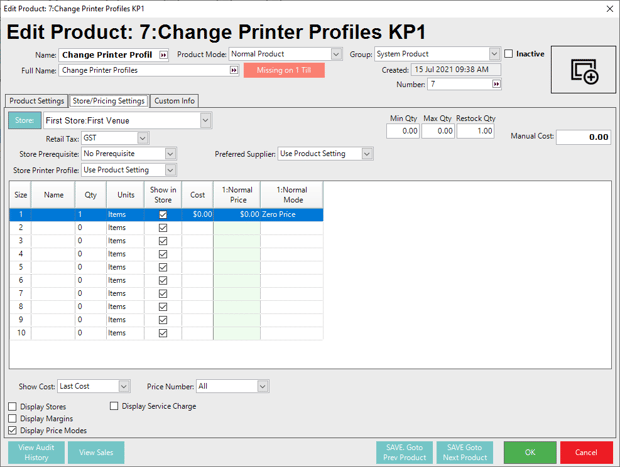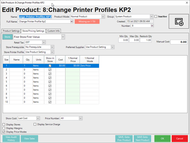In this example, I will be using 2 System products at zero price to Switch Printing profiles on my product base from Printer Profile KP 1 and to have the ability to switch back to the Printer Profile of KP2