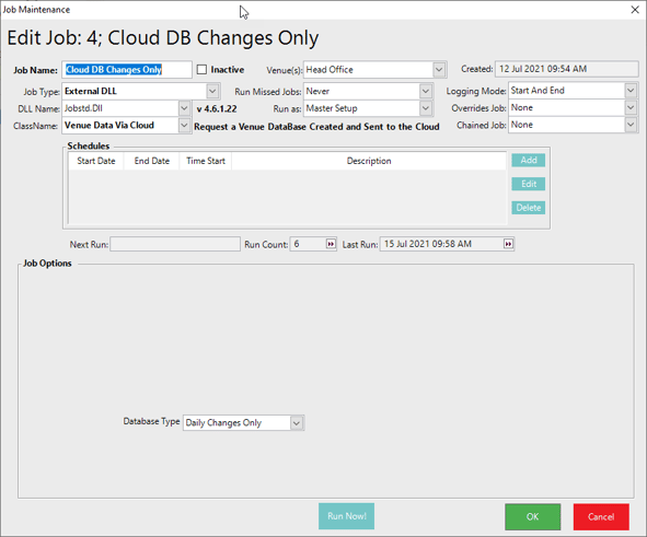 These Scheduled jobs will also be used to trigger using a custom audit to trigger the Scheduled job at Head Office and then chain a Venue Cloud Database to ensure that changes are sent to the remote sites.