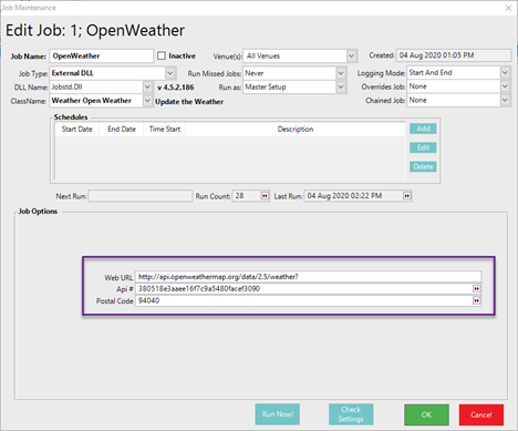 Create a New Scheduled Job → DLL NAME: Jobstd.dll → ClassName: Weather Open Weather
