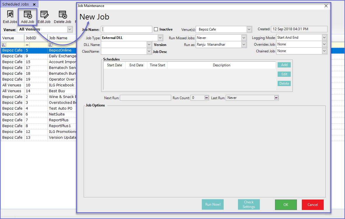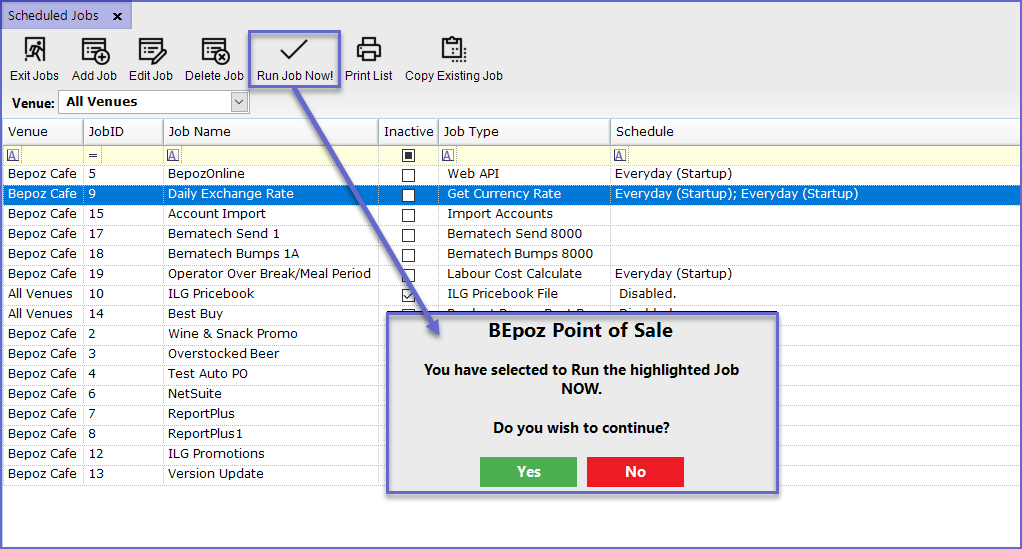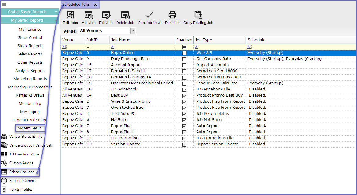 - The window will also list - either by Venue or All Venues - currently configured Scheduled Jobs