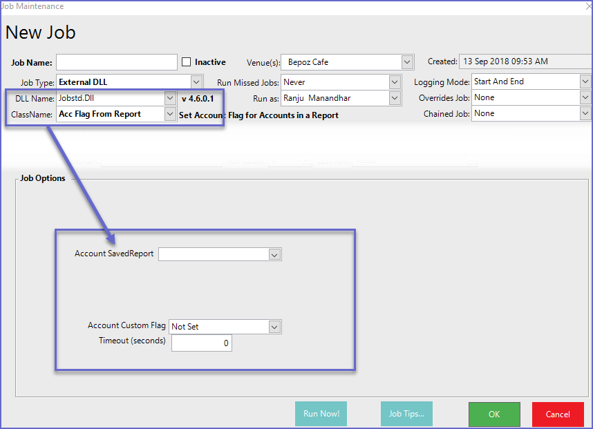 - The Job Options for this type varies according to the DLL Name and Class Name selected
