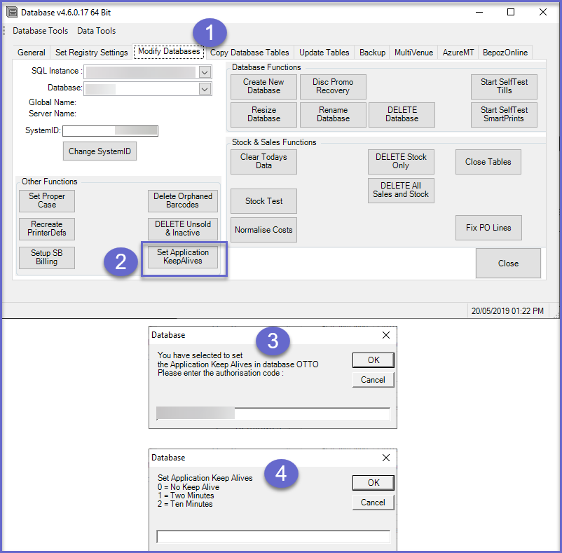 Note: As of v4.6, The 'Set Application Keep-Alives' button in database.exe replaced the 'Send Application Keep-Alives' flag in the Flags Tab in Global Settings in BackOffice.